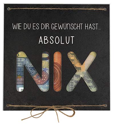 - Mit witziger Aufschrift: „Wie du es dir gewünscht hast. Absolut nichts.“