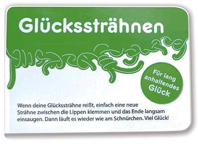 - Mit witziger Aufschrift: „Wenn deine Glücksträhne reißt, einfach eine neue Strähne zwischen die Lippen klemmen und langsam einsaugen. Dann läuft es wieder wie am Schnürchen. Viel Glück.“